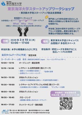 採択事業の一環として、下記の通り本学の教職員と学生を対象に東京海洋大学スタートアップワークショップを開催します。フォーラム(3月17日開催)と合わせてぜひご参加ください。