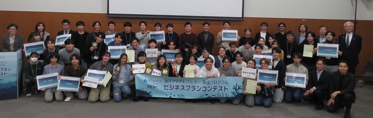 今年度も、令和7年12月20日(土)に「東京海洋大学ビジネスプラン・コンテスト 2025」を開催しました。今回は17チーム・56名が参加しました。参加者の中心は「海の起業論Ⅰ」を受講する学部1年生ですが、学部・学科を横断して結成されたチームや大学院生の参加、また昨年度から引き続いての参加者も見られ、「SDGsの目標14『海の豊かさを守ろう』に関わるビジネスプラン」というお題のもと、多様なバックグラウンドを持つ学生が様々なビジネスプランを提案しました。